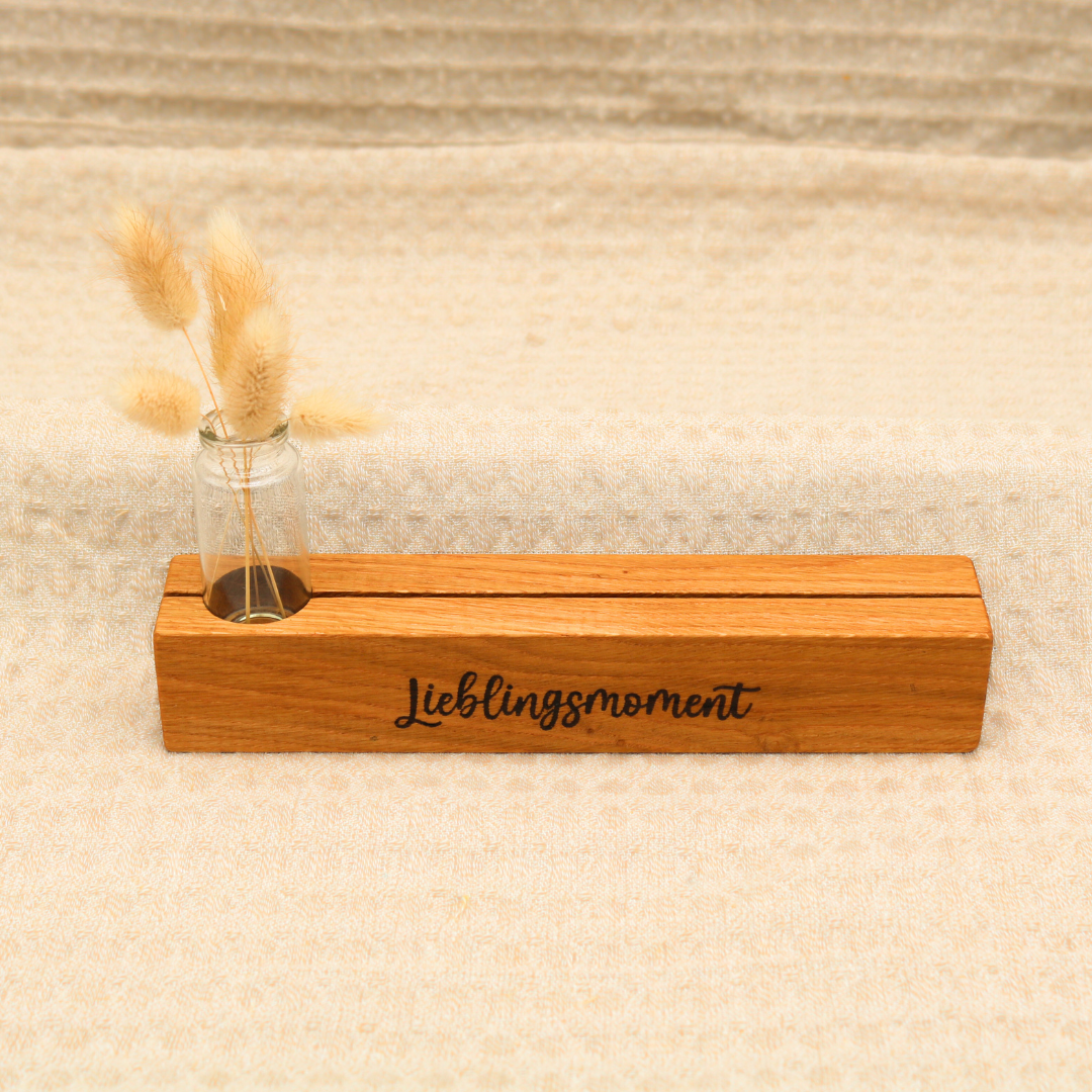 Diese edle Bilderleiste aus hochwertigem, geöltem Eichenholz ist mehr als nur ein praktisches Accessoire – sie wird zum Ort der Freude und der besonderen Erinnerungen. Mit einer Länge von 23 cm, einer Breite von 4 cm und einer Tiefe von 4 cm bietet sie Platz für persönliche Bilder. Die feine Lasergravur "Lieblingsmoment" verleiht der Leiste eine besondere Bedeutung und ist ideal für Plätze, die mit schönen Erinnerungen gefüllt sind oder gefüllt werden sollen.
